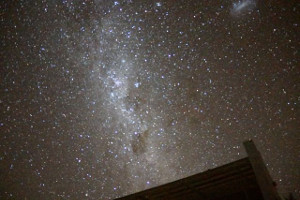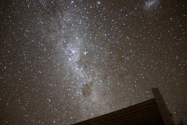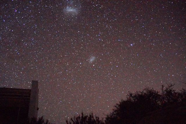 Auf dem ersten der beiden unteren Bilder sind die Magellanschen Wolken, oben im Bild die Große Magellansche Wolke und mittig die Kleine Magellansche Wolke, zu sehen; auf dem unteren Bild ein Ausschnitt des Bandes der Milchstraße, wie man es auch hier Nachts an sehr dunklen Orten sehen könnte.