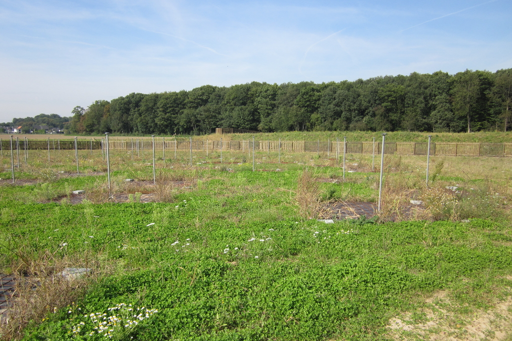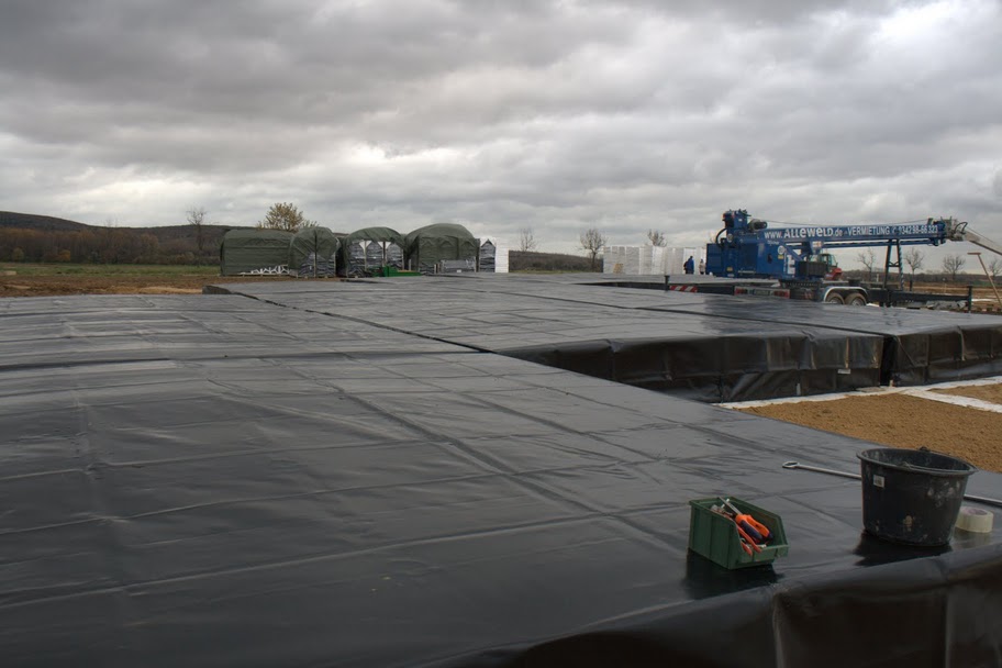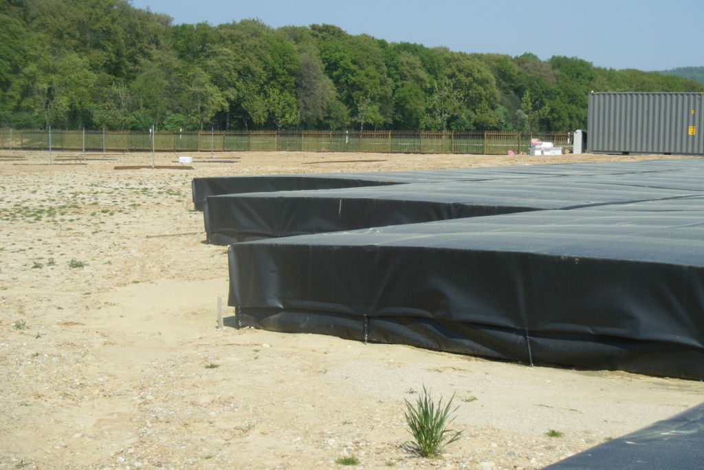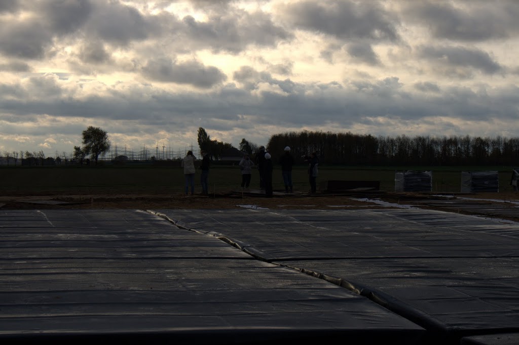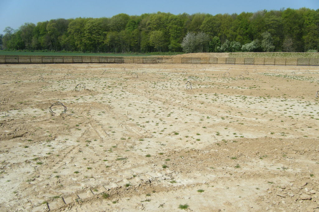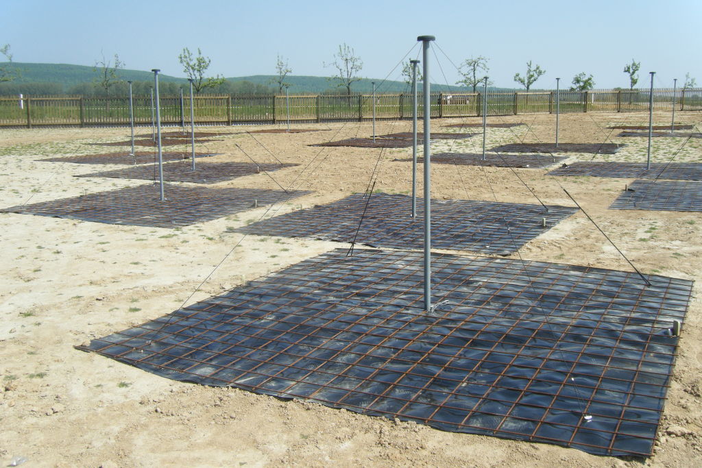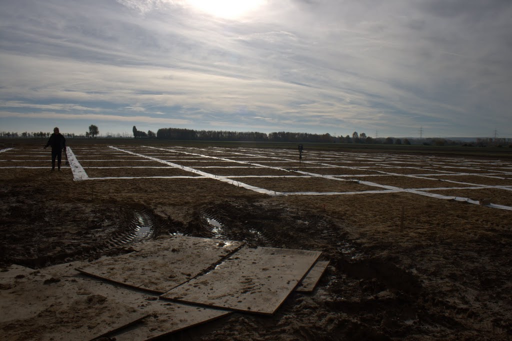 Das vorbereitete Feld. Die späteren Lücken zwischen den Antennen werden mit einem Vlies abgedeckt, um den Wuchs von Vegetation zu verhindern. (M. Jütte)