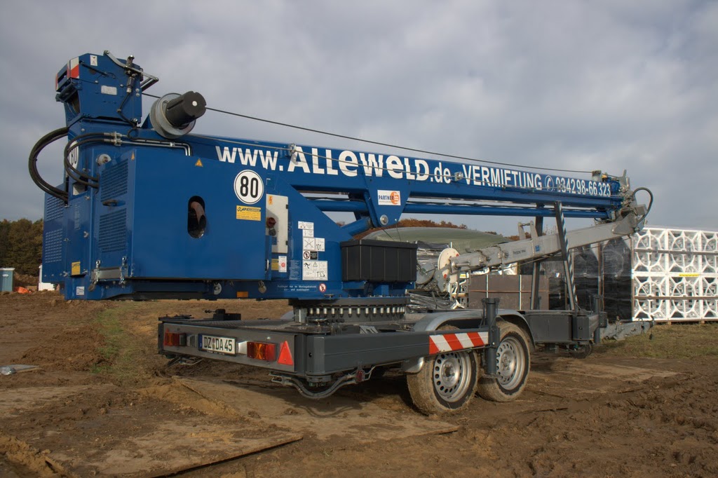 Der Kran, mit dem die Antennen auf dem Feld verteilt werden. (M. Jütte)