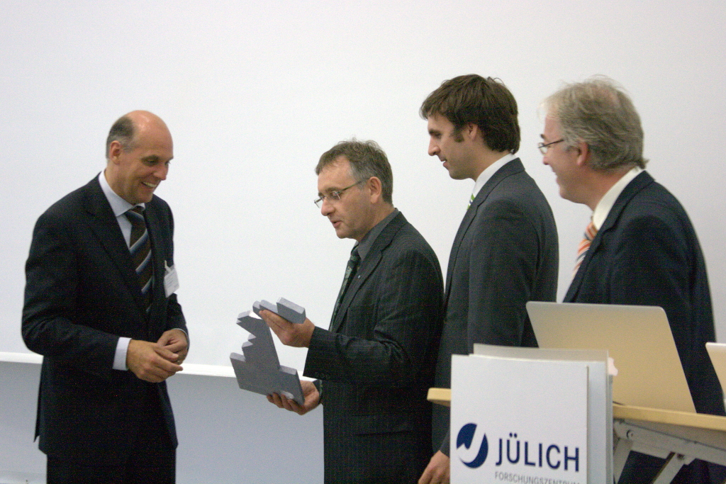 Am 5. Oktober 2011 wurde die Jülicher LOFAR-Station eröffnet. Symbolisch wurde dabei der Schlüssel zur Station unter den Kooperationspartnern aufgeteilt. Von links: Dr. René Vermeulen (ASTRON Dwingeloo), Professor Ralf-Jürgen Dettmar (Ruhr-Universität Bochum), Professor Marcus Brüggen (Jacobs University Bremen) und Professor Thomas Lippert (JSC Jülich). (B. Biskup)