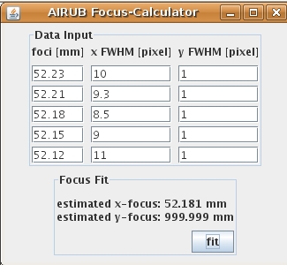 Wie im folgenden Beispiel zu sehen, trägt man jeweils die Foki mit den entsprechenden FWHMs (hier in x-Richtung) ein, und das Programm berechnet den optimalen Fokus durch einen parabolischen Fit: